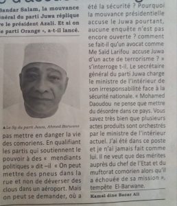 Suite à l’acte de << Terrorisme>> survenu à l’aéroport de Bander Salam, la mouvance présidentielle accuse le parti Juwa. Sur ce le secrétaire générale du parti juwa réplique : le parti n’a aucune intérêt de porter des préjudices contre le président Azali. Et si on accuse, il faut des preuves. Rien ne m’empêche d’accuser le parti Orange a-t-il lancé.