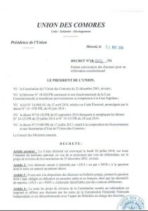 Le Président de l’Union des Comores, comme annoncé lors de son allocuation solenelle, vient de signer le décret n°18-026/PR portant convocation des électeurs pour un référendum constitutionnel.