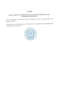 Le corps électoral est donc convoqué le lundi 30 juillet 2018, sur toute l’étendue du territoire national, en vue de se prononcer par voie de référendum, sur le projet de révision de la Constitution du 23 décembre 2001, révisée.